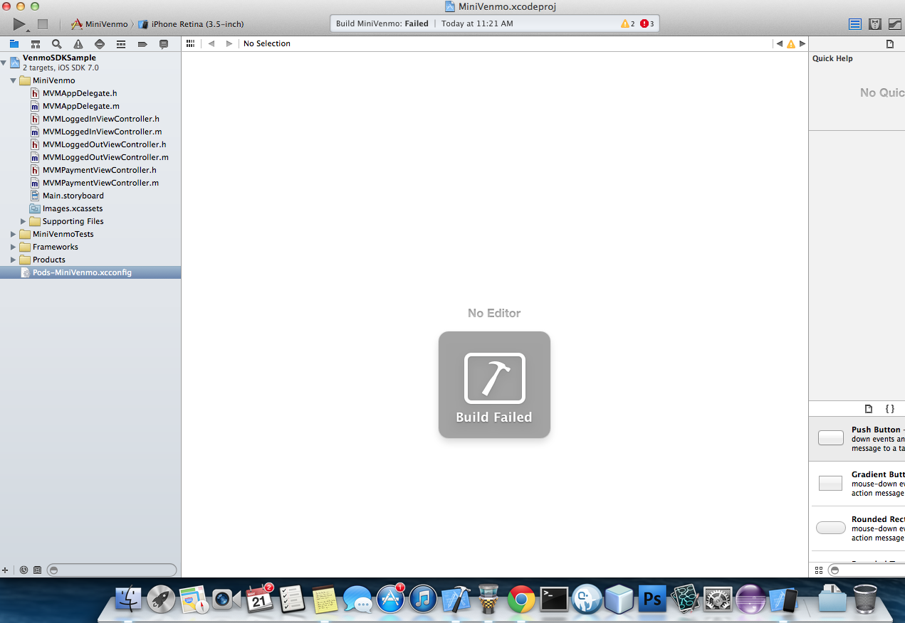 更新: i从venmo-ios-sdk下载项目。打开样例项目并尝试运行。但它甚至没有编译。