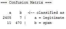 然而,Weka混淆矩阵是完全可以的。以下是根据传统垃圾邮件分类任务对正反两类的定义:
