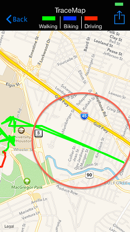 然而,正如你在下面的截图中所看到的,我的坐标不时地跳跃,即使我没有步行/骑自行车或驾驶那个位置。为了指出问题,在图像上画了一个圆圈。我的问题是为什么突然间坐标会跳跃?