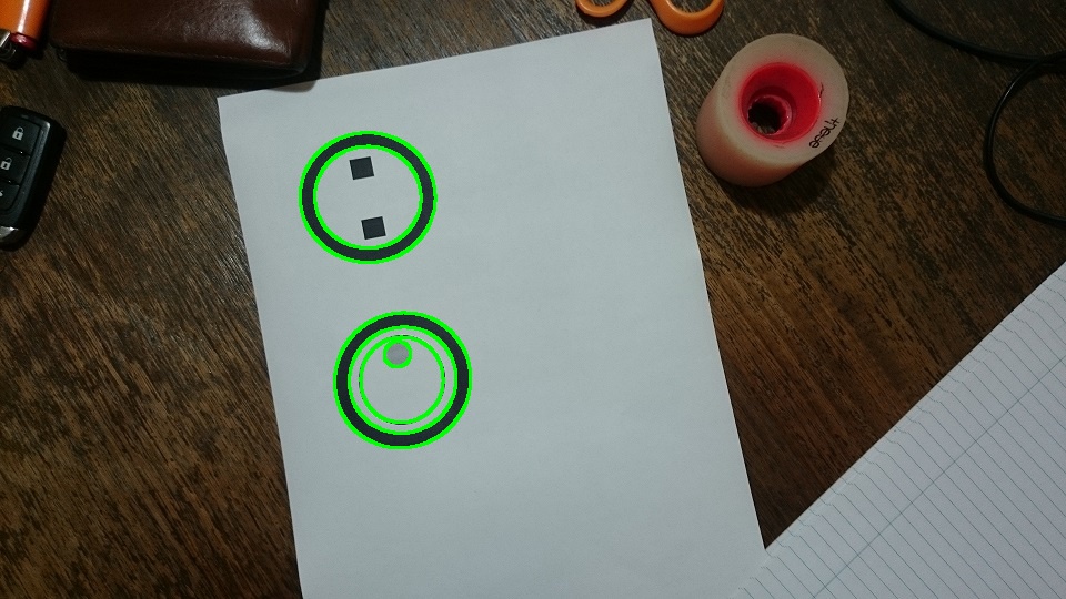 但是现在我需要过滤掉我不想要的标记。我的笔是最下面的。所以,一旦我找到了一个轮廓,就是一个圆,我想要检查是否有其他的圆形轮廓存在于第一个圆的区域内,最后检查最小圆的颜色。