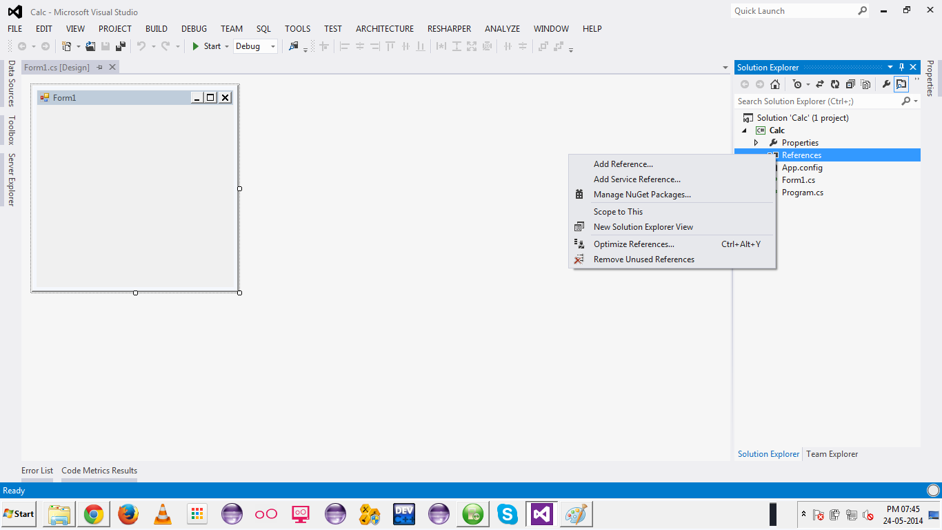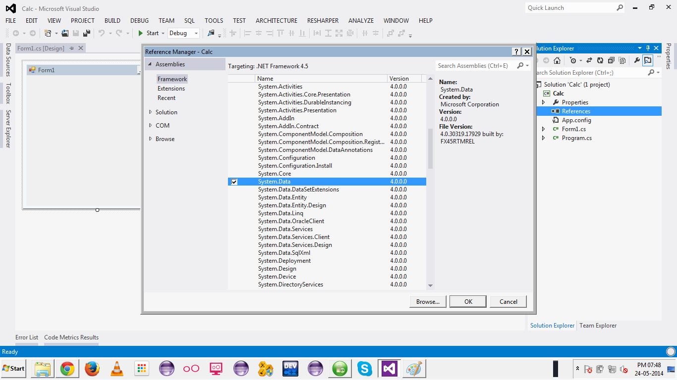 在Visual的Solution Explorer窗口中,右键单击项目,然后单击Add Reference。在那里,您可以添加程序集引用,有时需要这些引用来使用某些名称空间(如System.Data)。