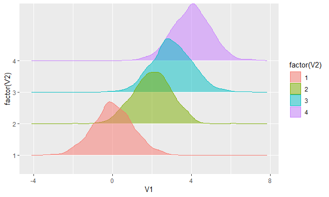 ggplot(my.data, aes(x = V1, y = factor(V2), fill = factor(V2), color = factor(V2))) +