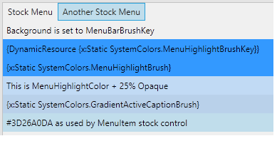 这个值就是我通过抛售MenuItem的ControlTemplate发现的硬编码。正如您所看到的,这是与顶部菜单相匹配的颜色(与任何SystemColor不对应),正如我所怀疑的那样,它有一个alpha值。
