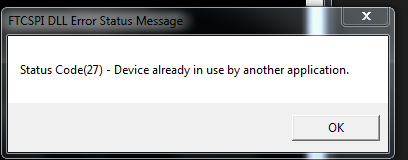 我正在尝试使用VisualC++ (http://www.ftdichip.com/Support/Soft...SSE/FTCSPI.htm)的第二个示例代码来连接到FT2232H Mini模块。我的代码工作,并表明没有设备连接时,没有。但是,当我连接板,然后运行代码时,我会收到附加的消息(该设备由另一个应用程序使用)。我不知道我为什么要收到这个信息。任何投入都非常感谢。