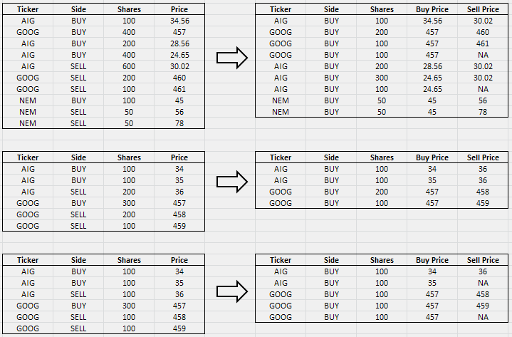 inputDF3 <- data.frame(Ticker = c(rep("AIG", 3), rep("GOOG", 3)), Side = c(rep("BUY", 2), "SELL", "BUY", rep("SELL", 2)), Shares = c(100, 100, 100, 300, 100, 100), Price = c(34, 35, 36, 457, 458, 459))