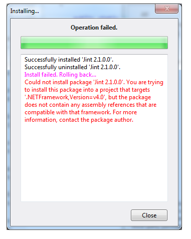 我试图在我的C# WinForms应用程序中使用Jint,但是NuGet拒绝安装这个软件包。我可以很好地安装其他软件包,包括这个叫做JavaScriptEngineSwitcher.Jint的包。我搜索了一下,找不到其他有同样问题的人。这个错误说它的.NET框架版本有问题,但我的理解是,4.0应该是很好的(尽管如此,我玩过它,但什么都没有用)。