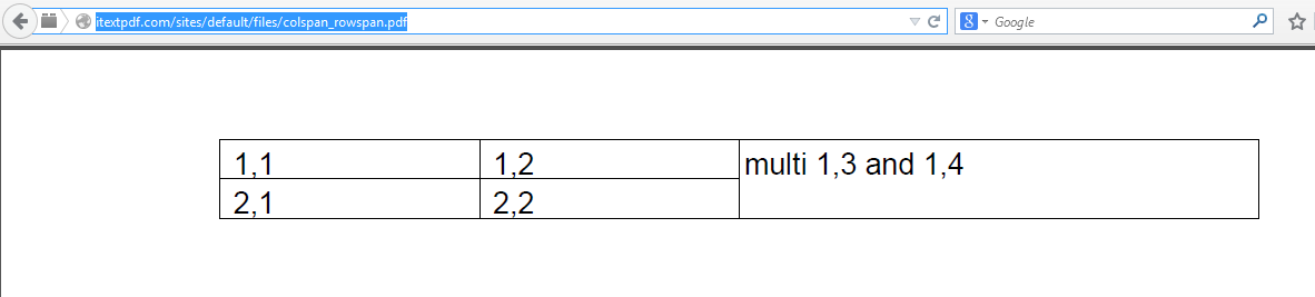 这似乎是我们想要的行为。我只能想到两个不同之处:(1)您忘记添加实际的表(这是我最初的回答),或者(2)您使用的是一个强大的旧版本的iText,其中没有完全支持行跨度。