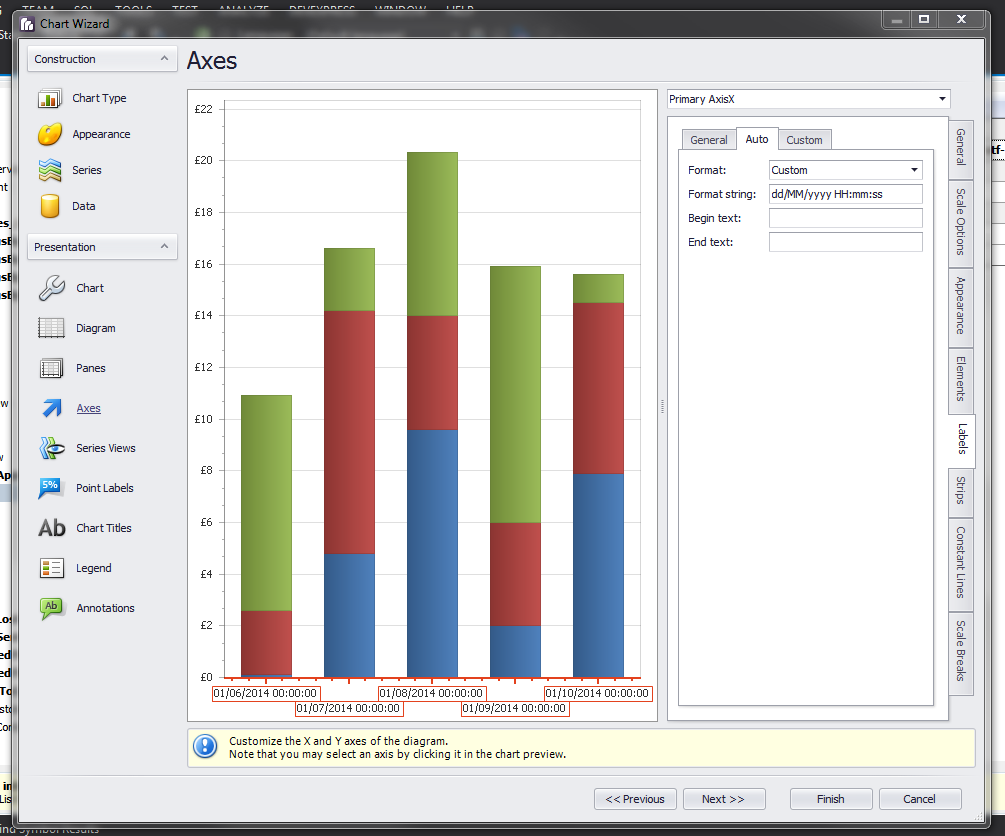 如果您正在使用图表向导,请从导航中进入轴并确保其位于XAxis上,然后转到标签选项卡并选择自动选项卡,从格式下拉选择自定义和格式字符串集dd/MM/yyyy :mm:ss。