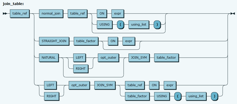 野牛语法 for MySQL可以由语法转换器处理以将其转换为W3C符号。由此,铁道图发生器生成如下语法图: