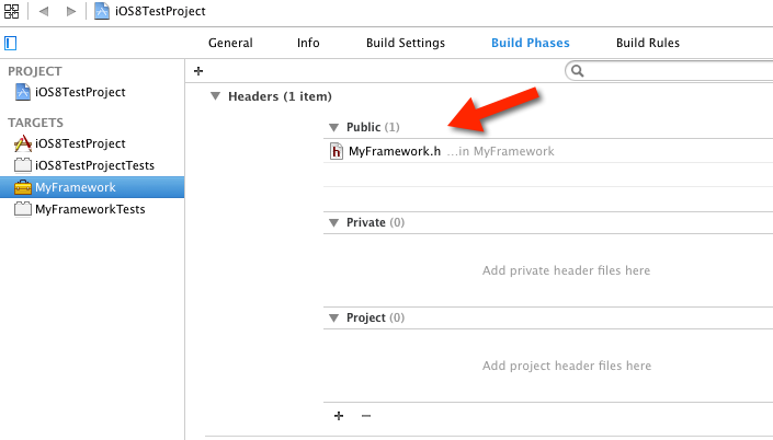 我能够通过进入框架的目标并在Header下的Build阶段选项卡上删除MyFramework.h文件来克服错误