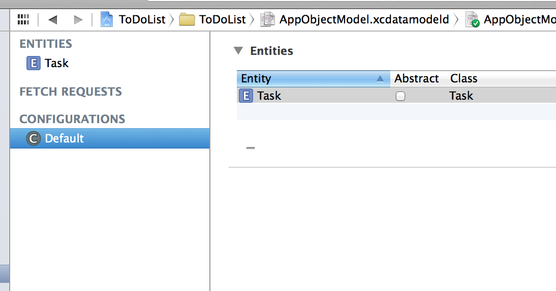检查以确保在“实体”检查器(屏幕右侧,实用程序窗格)中,当在模型中选择任务时,它的Class字段中正确地填充了" Task“(默认情况下为空白)。