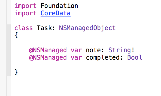 我已经将数据模型数据建模器配置中的子类设置为自定义子类的名称,并且在代码中,它正在扩展NSManagedObject类。