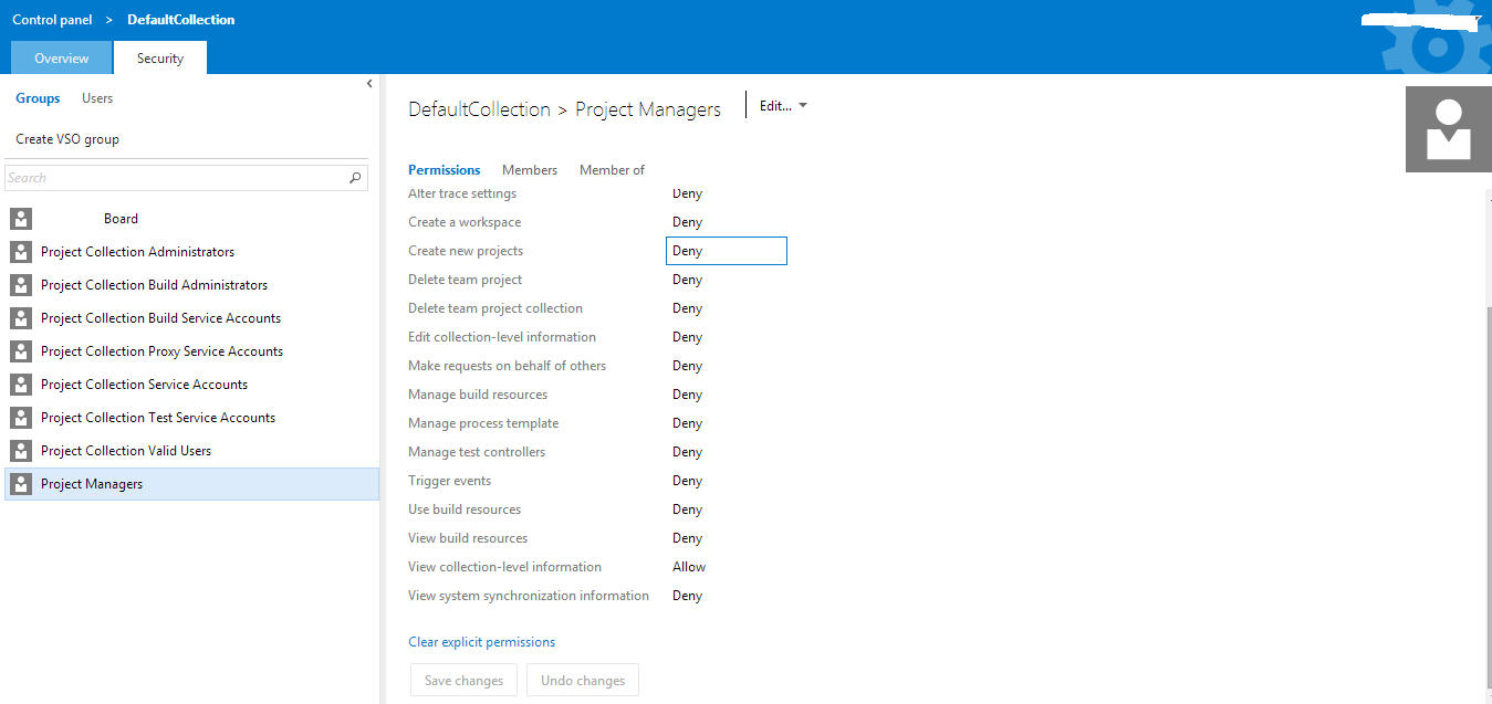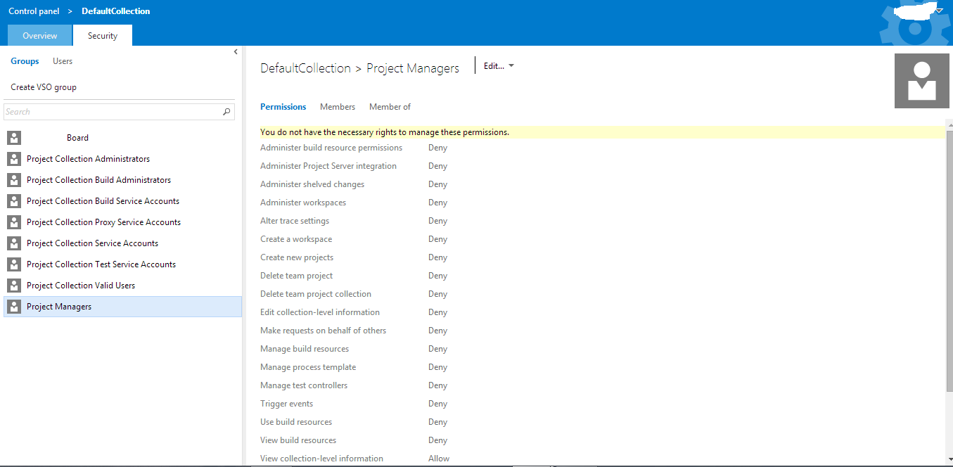 我在使用一个测试帐户,就好像它是一个项目经理。我为项目经理创建了一个组,除视图集合级别之外,我拒绝了他们的所有权限(这对他们从一开始就访问项目至关重要)。