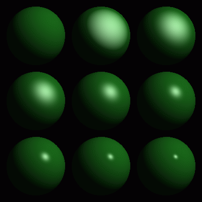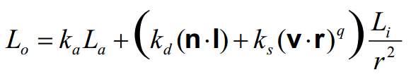 其中n是正常的,l是对光的方向,v是对照相机的方向,r是光的反射。这些方程在维基百科的文章中有更详细的描述。