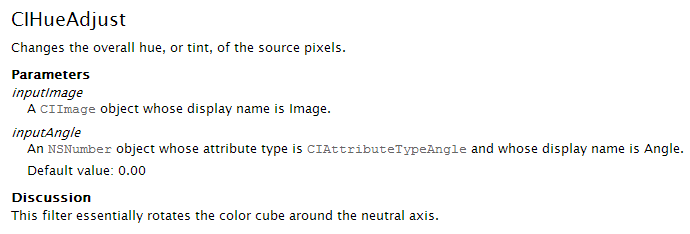 CIFilter *hueAdjust = [CIFilter filterWithName:@"CIHueAdjust"];