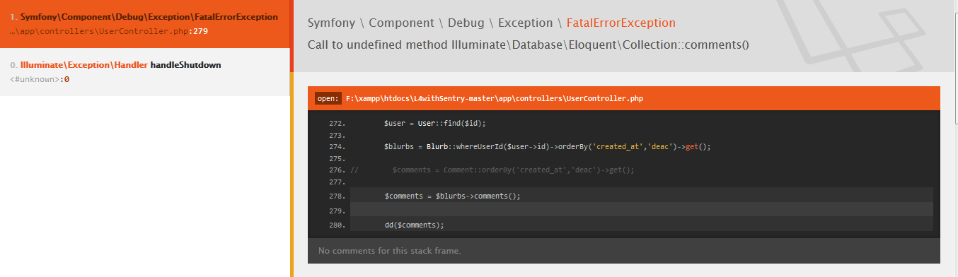 但在我的UserController.php中,我无法访问我的评论。我试着用这些代码:
