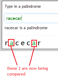 return checkPal(input, ++i, --j);