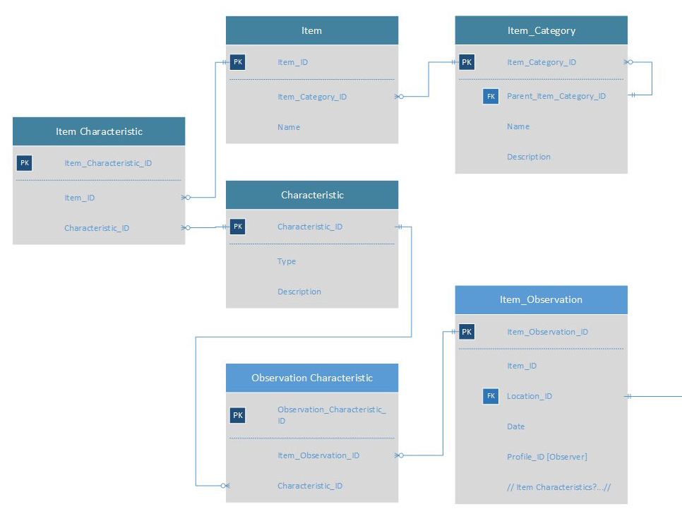 我感到困惑的地方是,我应该如何记录/引用Item_Observation表中的特性表中预先定义的特征,因为我必须创建另一个多到多的表来保存这些特性,但是我觉得由于表复制,我没有很好地实现它?但是我觉得--我不能百分之百确定为什么--把观察到的特征的数据存储在查表中,这也不是一个好主意吗?