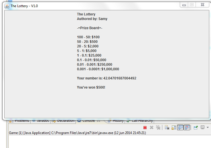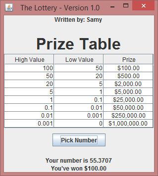 JLabel label = new JLabel("<HTML>The Lottery<BR>Authored by: Samy<BR><BR>-=Prize Board=-<BR><BR>100 - 50: $100<BR>50 - 20: $500<BR>20 - 5: $2,000<BR>5 - 1: $5,000<BR>1 - 0.1: $25,000<BR>0.1 - 0.01: $50,000<BR>0.01 - 0.001: $250,000<BR>0.001 - 0.0001: $1,000,000<BR><BR>Your number is: "+lotteryChance+"<BR><BR>"+winnings+"</HTML>");