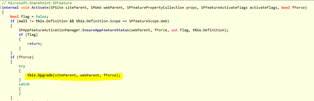 您的计时器作业是否循环了Force的功能激活?然后,是的,它触发了功能升级/功能更新--请参阅来自SPFeature.Activate的以下屏幕快照(请参阅我的黄色标记):