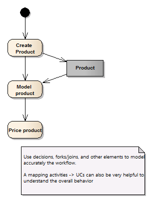 如果是这样,这里的重点是建立工作流(User)和用户权限。权限很容易使用参与者和UCs之间的关联来显示。