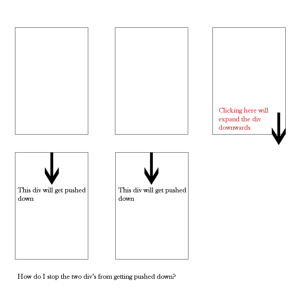 当该div被展开时,它自然地将div向下推到第二行。我希望第二条线上的div不被推倒。我怎样才能做到这一点?