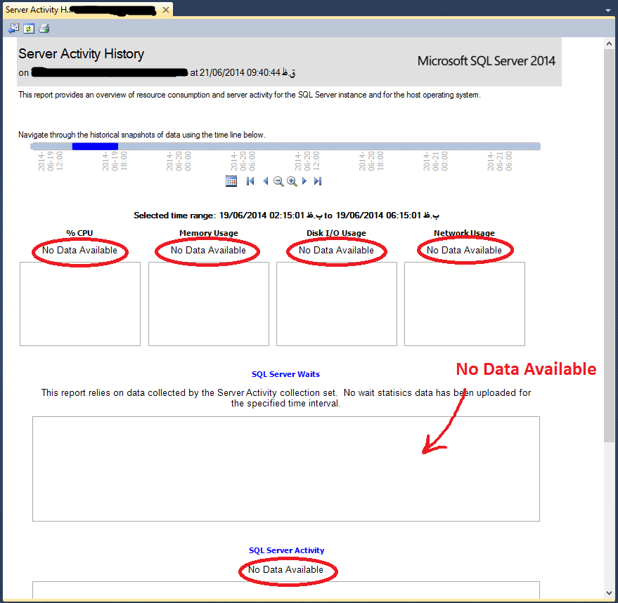 但是每次我从Data Collection得到报告时,都无法显示数据。下面的图像是数据收集报告的示例Server Activity History报告。