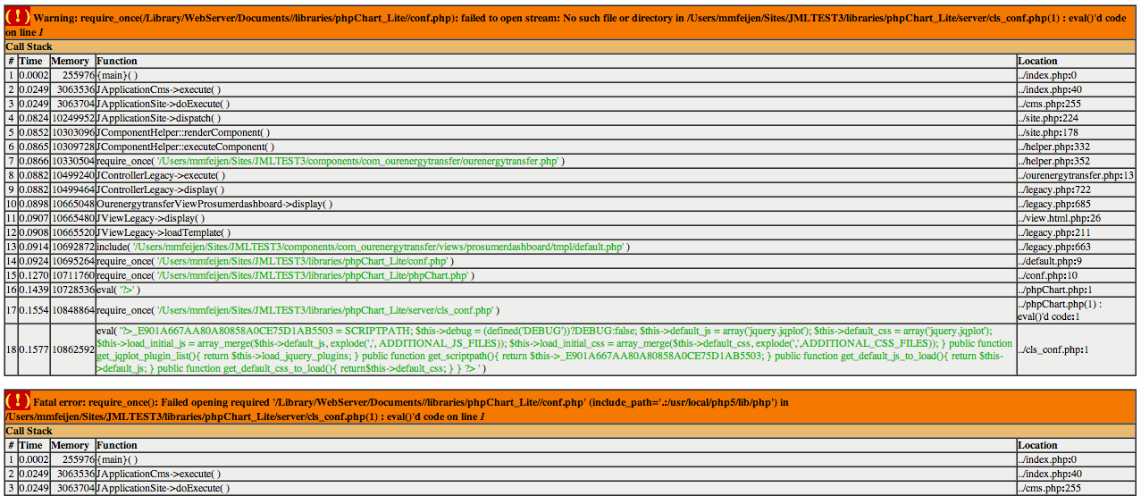 错误消息似乎表明错误发生在phpChart文件(特别是server/clscon.php)中,而不是组件中。上传之前你更新了SCRIPTPATH吗?