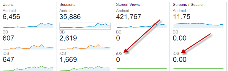 }SetupGoogleAnalytics在didFinishLaunchingWithOptions上被调用。在进行这些更改之后,我仍然在“屏幕视图”&“屏幕/会话”部分中看到零。老实说,我不知道我错过了什么让它正常工作。下面是我用来集成它的https://developers.google.com/analytics/devguides/collection/ios/v3/screens#manual的链接