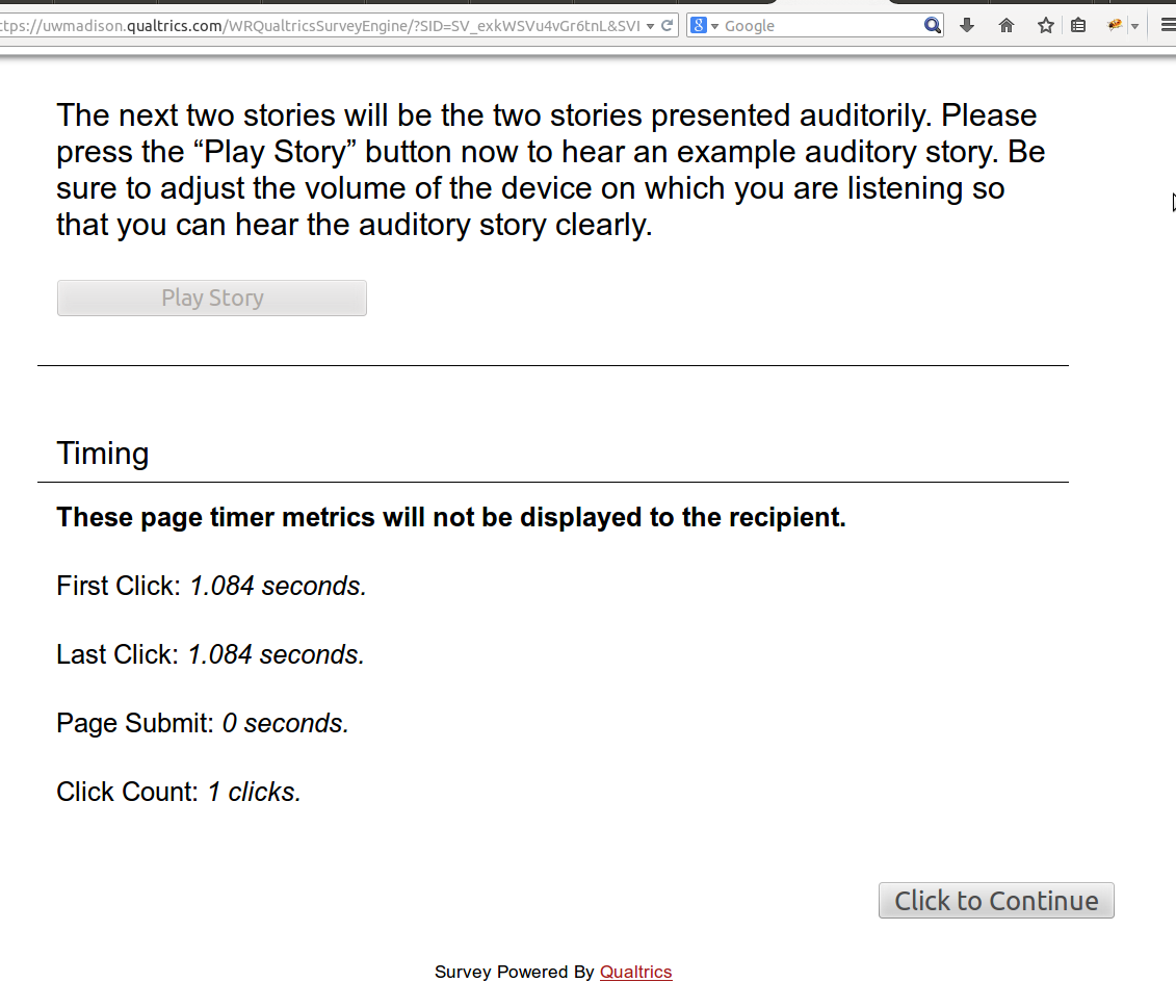 Now that you know how the auditory stories will sound, you are ready to listen to and comprehend the two auditory stories in this study. The first auditory story is titled, “The Honey Gatherer’s Three Sons.” Press the “Play Story” button to begin listening to the story; after you have finished listening to the story, you will answer a set of questions about the story.