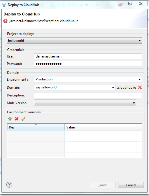 在使用Mule 3.5在云中心部署应用程序时,我也遇到了类似的问题。我的应用程序从Salesforce“Contact”对象中插入CSV文件中的联系人信息(FirstName、LastName、Title、Email等)。在配置了代理详细信息之后,我的应用程序在本地机器上运行良好,但是当部署到云中心时,我得到了“未知主机异常。代理中的根异常(与此类似)”异常。