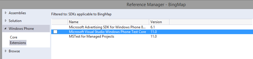 刚刚下载了必应2013。既然我已经完成了,我应该点击项目->添加引用,我将在下看到它,但它不在那里。下面的图片是我得到的。我不知道如何使必应地图SDK活动。有人知道这件事吗?