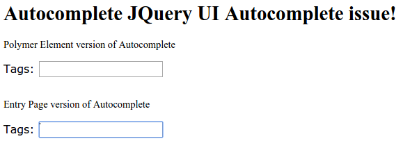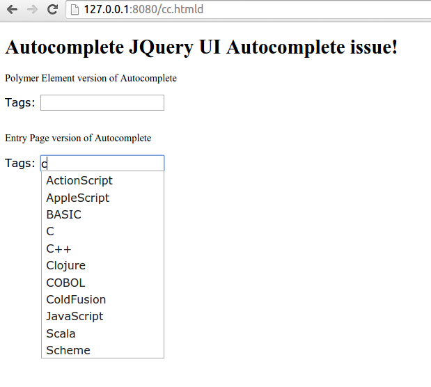我面临着以下令人困扰的问题:http://jqueryui.com/autocomplete/的代码示例在聚合物元素中使用时不能正常工作。我预计下拉列表将显示在输入元素的底部,但这会出现在页面的顶部。自动完成在条目页面中正常工作,如预期的那样。请看下面的代码。我的聚合物元件代码有什么问题?我能用JQuery UI和Dart聚合物一起使用吗?你能建议我有什么解决办法来解决聚合物和JQuery自动完成吗?我使用的最新版本的省道,省道-聚合物库和JQuery UI.