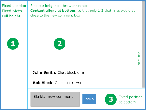 中间的单元格#2 (大的)将包含聊天线路,任何调整窗口大小的窗口都应该将滚动条放在该窗口上,而不是整个窗口上。单元格#2也应该对齐底部的内容,这样只有1-2行而不是在窗口顶部很远。