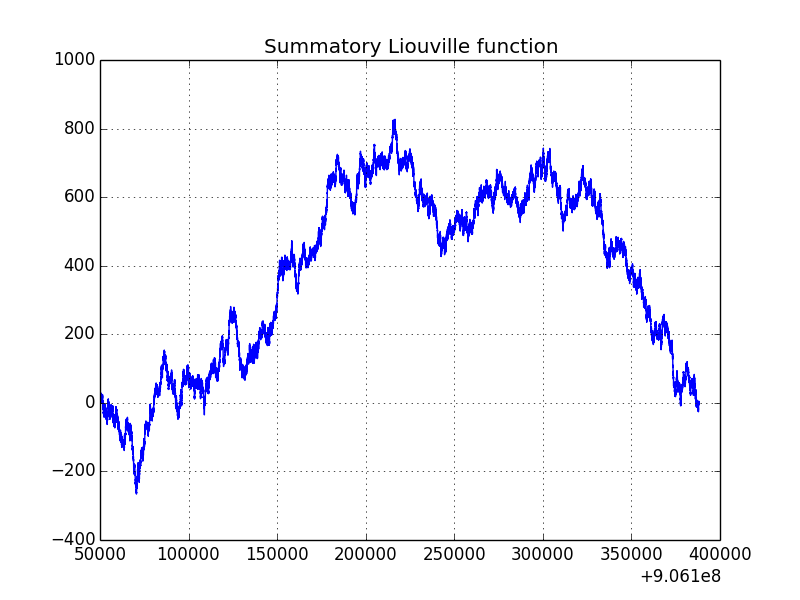 由于第一个数字的一些问题,上面的代码给出的结果稍微差一些。要获得官方的Liouville lambda,请使用cumulative[n-1] + 2。对于问题(906 316 571)中提到的数字,结果是cumulative[906316570] + 2等于829,这是该区域的最大值。