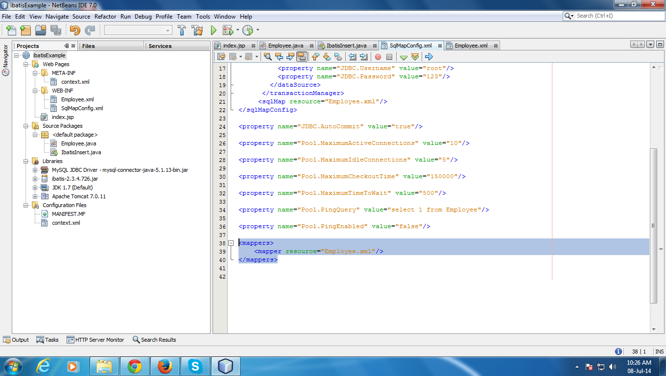 我是新来的。我在上面读过一些特写,并试着工作,但这对我来说并没有发生。可能是我在这里面临xml文件的放置问题。这里是我的工作流程>>>,我在netbeans中使用了一个项目,并将ibati-2.3.4.726.jar与Mysql驱动程序一起保存在库包中。然后,我创建了Employee.xml和SqlMapConfig.xml文件,并将它们保存在网页/ Web包下。然后我创建了Employee.java和IbatisInsert.java文件,并将它们保存在源代码包/默认包文件夹下。现在,当我运行IbatisInsert.java文件时,它显示了以下消息>>>
