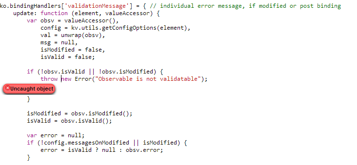 现在,当我使用自定义的validationMessage绑定来显示错误时,我在ko验证库中得到了以下错误: