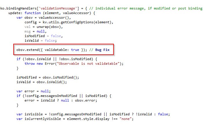 在knockout.validation.js文件中的validationMessage绑定处理程序下添加以下行: