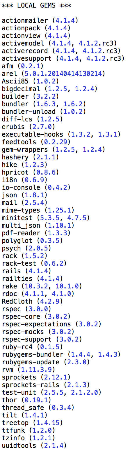 Gems included by the bundle:*班德勒(1.6.3) *diff lcs (1.2.5) * rake (10.3.2) * rspec (3.0.0) *rspec-核心(3.0.2) *rspec-预期(3.0.2) *rspec-模拟(3.0.2) *rspec-支持(3.0.2)