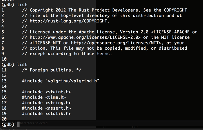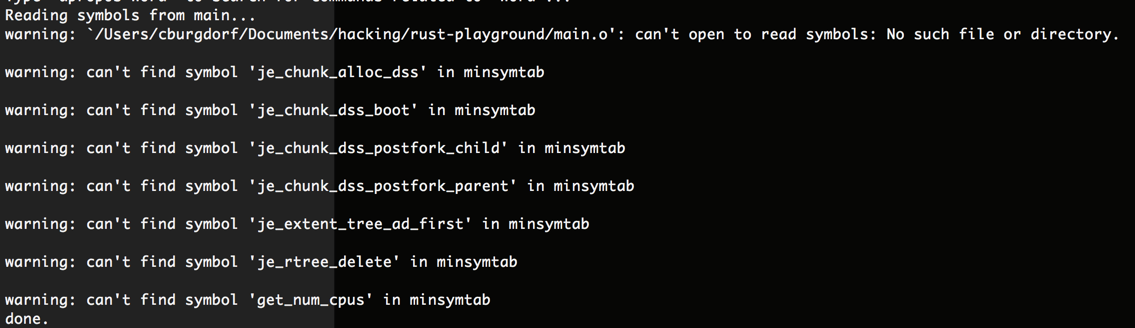 我做错了什么?我的gdb版本是7.7,我在OSX10.9.2 (13C64)上。我的rustc版本是rustc 0.11.0-pre (3035d8dfb13077e195eb056568183911c90c1b4b 2014-07-02 21:26:40 +0000)