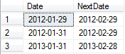 SELECT '2012-01-29' AS [Date], CAST(DATEADD(MONTH, 1, '2012-01-31') AS DATE) AS NextDate
