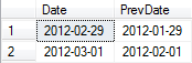 SELECT '2012-03-01' AS [Date], CAST(DATEADD(MONTH, -1, '2012-03-01') AS DATE) AS PrevDate结果