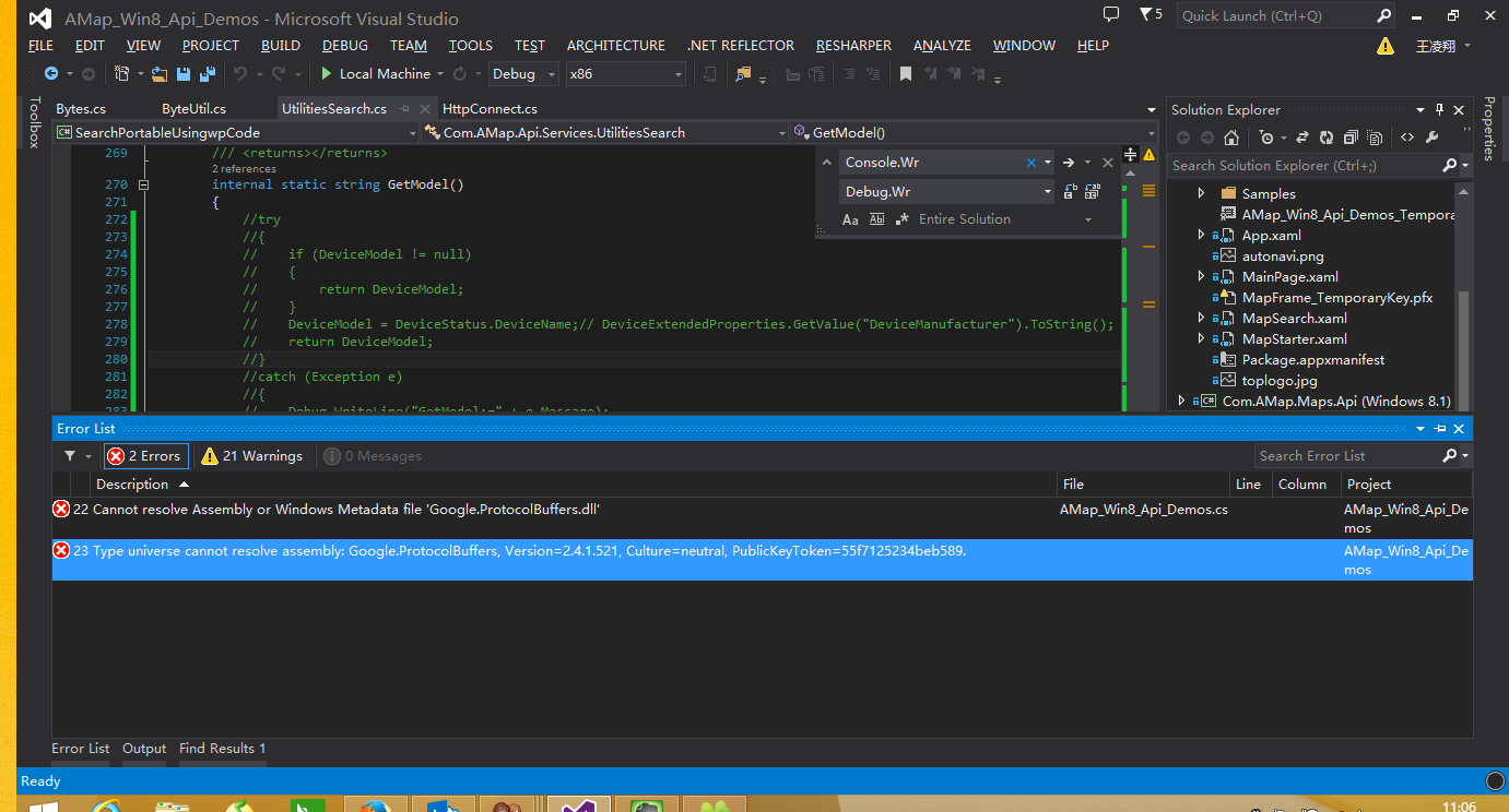 所以我决定改变,选择类库,我开发了自己的类库,它引用"Protocol.Buffers“,并将我开发的类库添加到我的演示应用程序中,并运行演示应用程序。