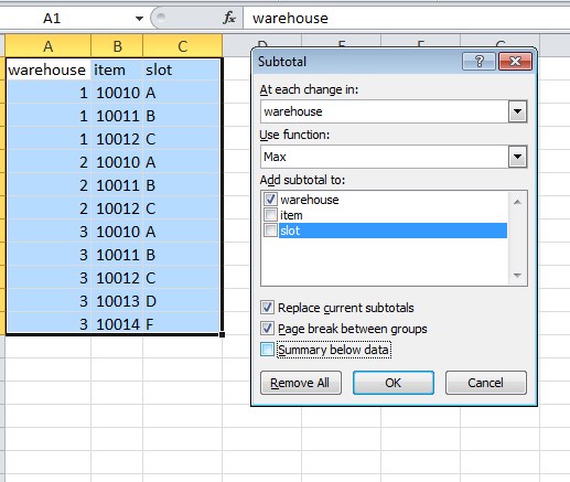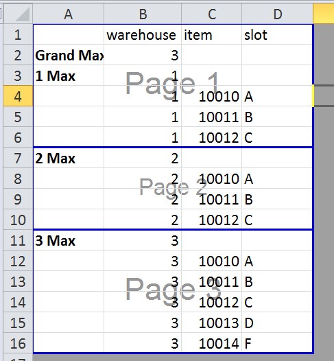 一种方法是使用SubTotals。在“数据小计”下,在“(仓库)”中的每个更改处进行选择,使用函数(最大值)向仓库添加小计。确保您检查过,组之间的页面中断。然后点击ok。您还可以设置页面以打印每个页面的标题。根据需要清理。