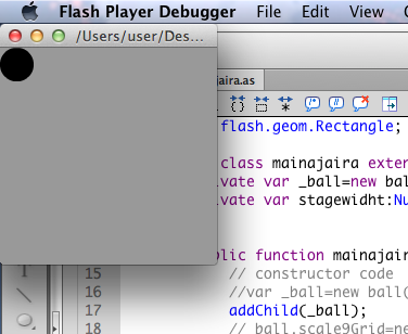 我是as3的初学者。当舞台尺寸变化时,我试图保持物体大小和位置不变。我希望我的物体大小和位置在舞台的任何情况下都一样。舞台可以是全屏的,可以由用户调整大小,也可以通过设备来调整大小。我已经在我的屏幕上添加了一个球,当我点击这个球时,屏幕会变成全屏。但在全屏模式下,我的球会改变位置和大小。它变大了。如何将球保持在舞台的左上角。请看下面的截图和我的代码。