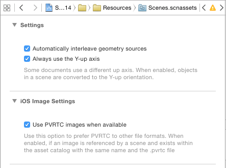 我不认为当您只是将DAE文件作为包资源包含时,就会公开该选项。(这可能是一个很好的缺陷要归档。)不过,最好还是使用新的SceneKit资产目录功能--将DAE文件和任何外部资源(纹理)放入一个具有.scnassets扩展名的文件夹中,Xcode将一起处理它们,以便在构建时对目标设备进行优化。然后,当您在Xcode导航器中选择该文件夹时,您将得到一个用于场景构建选项的编辑器: