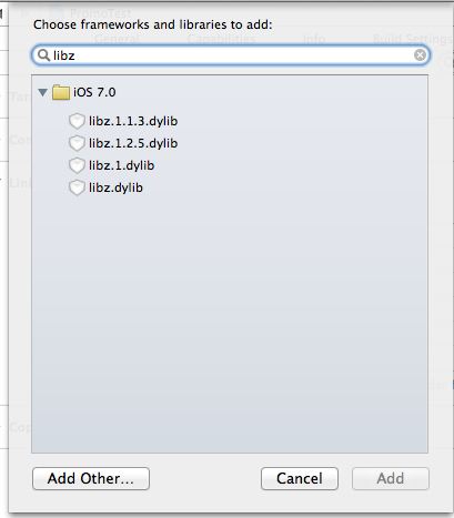本教程声明要添加libz.1.2.3.dylib.库,但是因为我下载了更新的或旧的库(我不知道我的库是否比教程中的库更新或更旧,但是99%是更新的)。所以,当我试图添加libz.1.2.3.dylib.库时,我没有找到它。但是,当我输入libz时,我发现了以下选择: