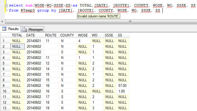 如何汇总不同的列以逐行汇总?在下面的图片中,您可以看到我的语句,肯定有问题,因为返回空值,但我不知道它是什么。我想创建一个TOTAL column summarizing WOSE, WO, SSSE and SS per row。有人能帮我吗?