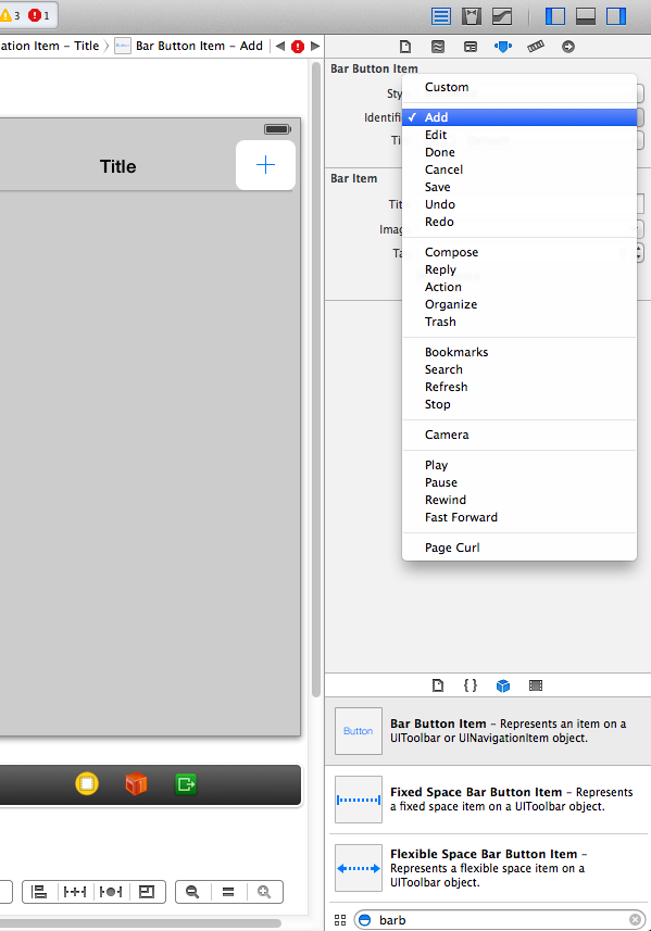 您可以从storyBoard also.Select获得barButtonItem,该barButtonItem添加在storyBoard.Go Attribute Inspector -> Idenifier中,如图像所示,并选择适当的Identifier