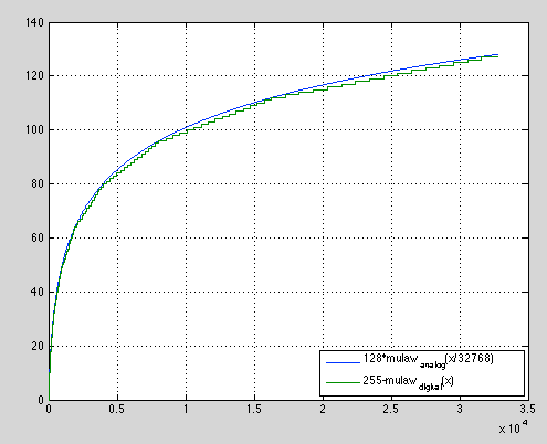 下面是一个比较这两个人的图表。您可以看到绿色线(mu_digital)中对应于离散7位值的楼梯,您还可以看到近似光滑蓝线的不同的线性段。